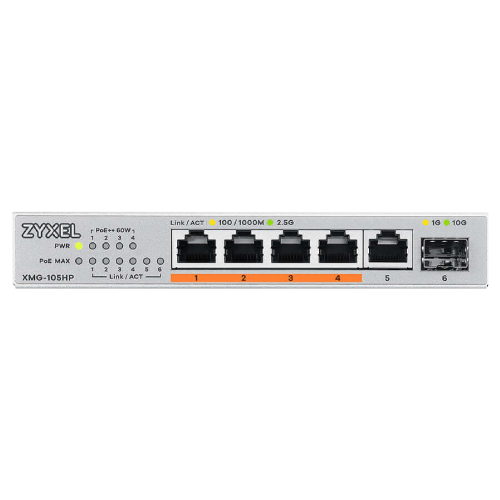 The Zyxel XMG-105HP 5-Port Unmanaged 2.5GbE PoE++ Access Switch is designed to upgrade and expand networks, and provide higher speed and better performance. It is ideal for home, SOHO, or small office users who need more bandwidth for their network with demands coming from online gaming, multimedia streaming services or faster wireless network connectivity. All ports are equipped with 2.5 Gigabit Ethernet speed, allowing easy network speed upgrade. In addition, the XMG-105HP offers an extra SFP+ slot for high-bandwidth network uplink or access to a Network Attached Storage (NAS).